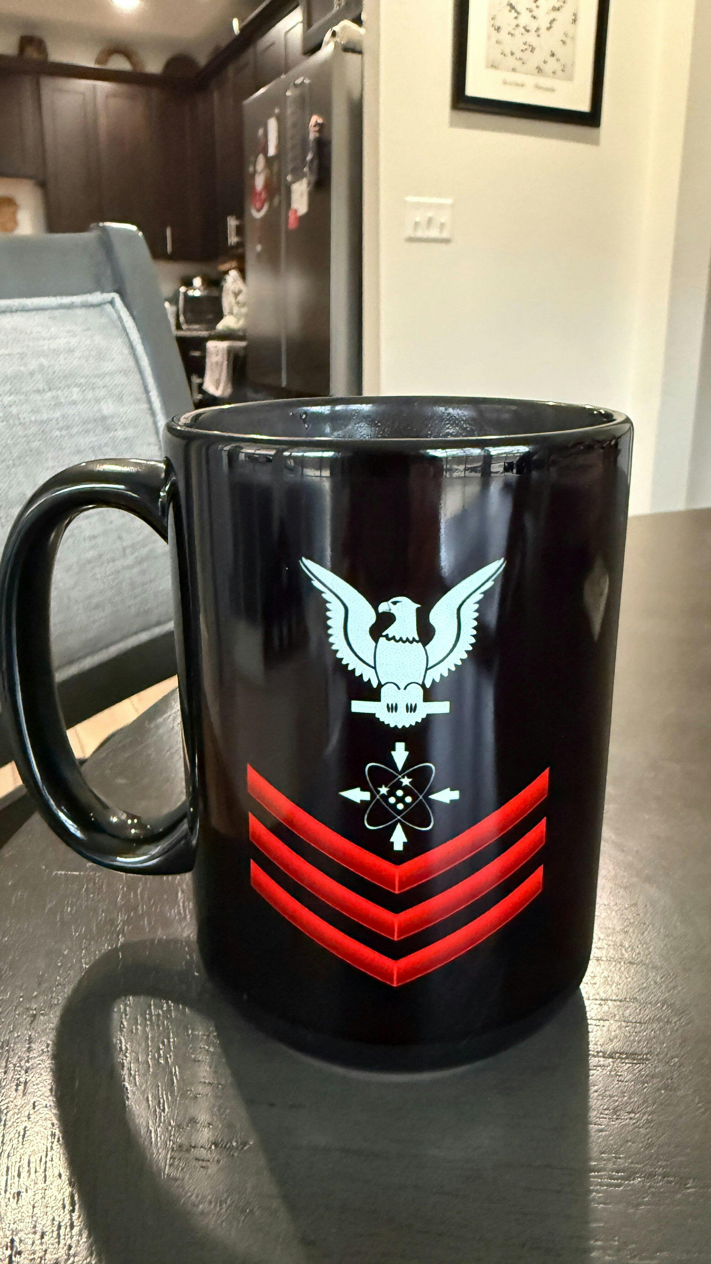 I've been looking for a mug that had my rating patch, and this is the closest one I have found. There is a slight problem with one of the arrows. Three arrows should be pointing into the atom and one arrow pointing out and that one should be an outline. (See the picture of a correct rating patch I uploaded and the png drawing.). I believe you took the one listed on Wikipedia and that one is incorrect.